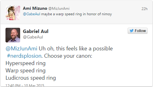 Twitter网友Ami Mizuno在@Gabriel Aul时提到“或许可以来个wrap speed”,然后Gabriel Aul就开玩笑似的回答到可以提供三个选项——Hyperspeed、Warp speed、以及Ludicrous speed。