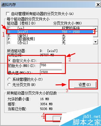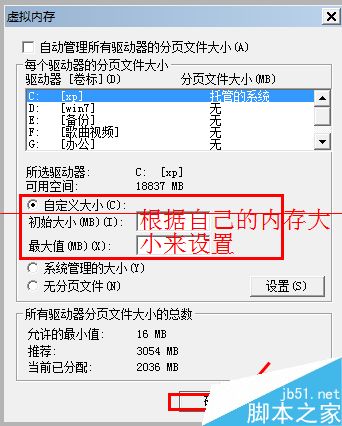 5、取消【自动管理所有驱动文件大小】选择【自定义】设置根据自己的内存设置[512MB的内存/虚拟内存设768MB--1.5G][1G的内存/虚拟内存设1.5G--3G]。[2G的内存/虚拟内存设3G-4G。初始大小和最大值,不能一样。点击确定。