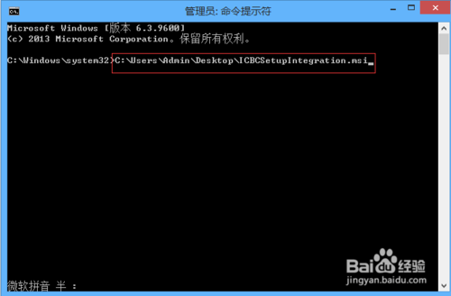 3、在弹出“命令提示符”窗口中,进入到工行网银助手所在的位置,我以存放在桌面为例:C:UsersAdminDesktopICBCSetupIntegration.msi,直接把上边的位置地址复制粘贴到命令行窗口,按下Enter键: