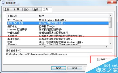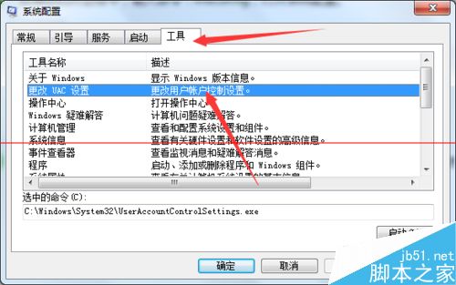 3、在弹出的系统配置窗口中,点击鼠标切换到“工具”栏,接着选中列表中的“更改UAC设置”。