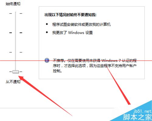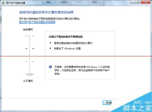 6、将拖动条拉到最下面,我们就可以关闭UAC功能。如果想详细了解,阅读右侧的说明即可。随后点击“确定”按钮保存修改。