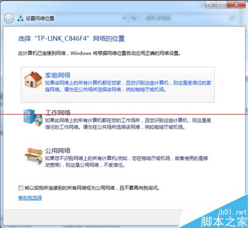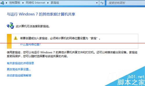 如果看到以下窗口,说明网络位置设置不正确。Windows 7 将网络分成家庭、工作和公共三种位置,只有处于家庭网络位置的计算机,才能创建家庭组。