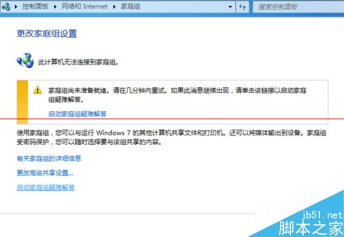 控制面板-->搜索家庭组-->单击启动家庭组,如果看到以下窗口,则说明家庭组依赖的服务或协议没有正常运行。