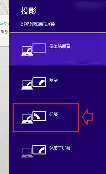 二、投影设置中,有“仅电脑屏幕”、“复制”、“扩展”、“仅第二屏”多种模式,这里我们选择【扩展】,如下图所示。