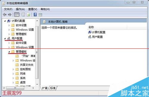 2、在打开的本地组策略编辑器窗口,我们找到:用户配置 - 管理模板;