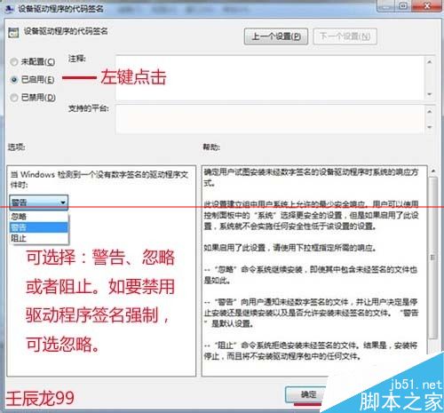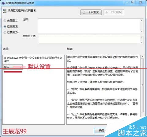 6、在打开的设备驱动的代码签名窗口,我们选择:已启用,在选项的下拉框中,有:警告、阻止、忽略供选择。