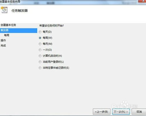 5、在弹出“触发器”窗口选择时间,因为每天下班都是周期性,这里选择每周(具体根据个人设置而定),然后点击下一步!