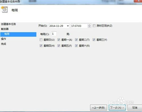 6、在“每周”窗口中,我们需要设置开始日期、时间、相应周期间隔,然后点击下一步!