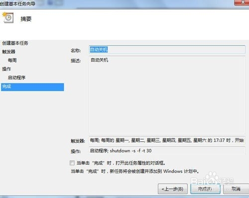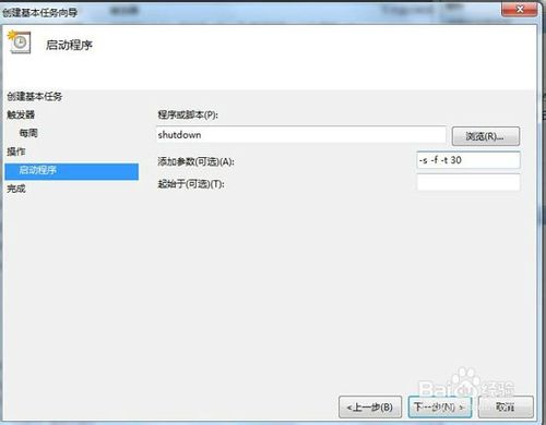8、在“程序或脚本”输入shutdown,“添加参数“输入-s -f -t 30,意思是任务触发后,将30秒内自动关机,然后点击下一步,选择完成!