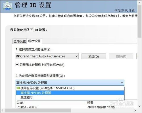 为程序选择首选图形处理器:打开Nvidia控制中心-管理3D设置-为程序选择首选图形处理器-高性能Nvidia处理器-应用