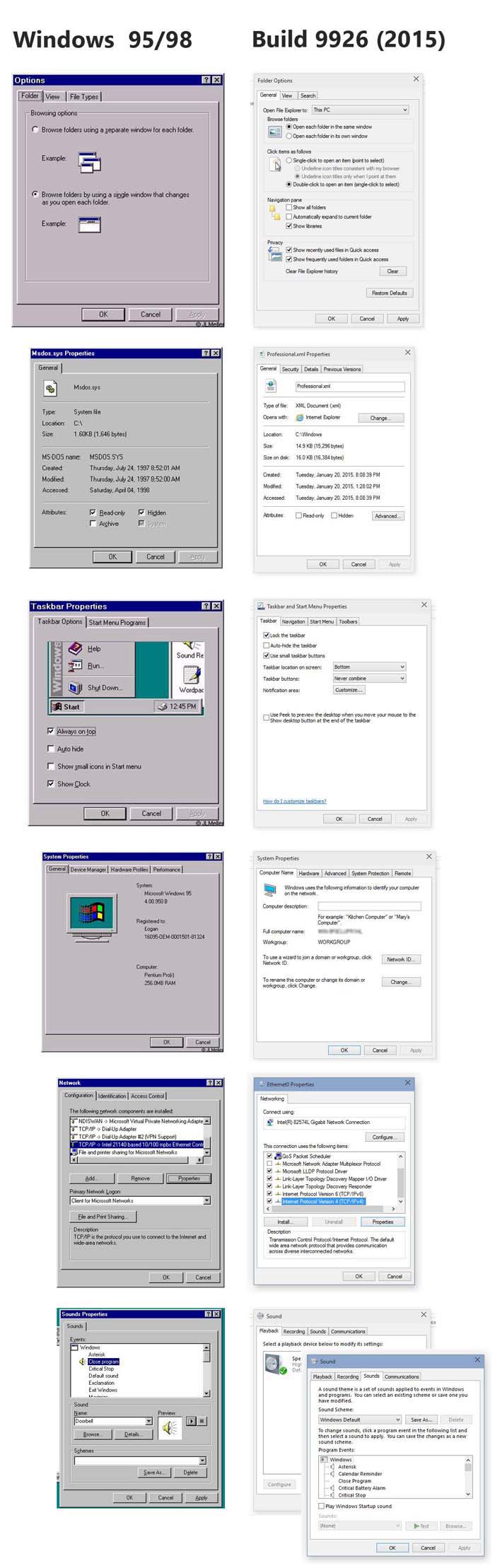 从放出的对比图来看,微软只是稍微调整了视觉效果,因为 Windows 95 系统上的很多选项到了2015 年几乎还是一模一样,符合微软口中“给予用户熟悉感觉”的承诺。