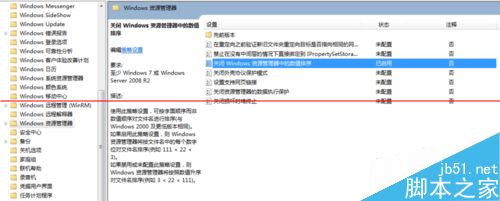 4、在右边窗口找到“关闭 Windows 资源管理器中的数值排序”