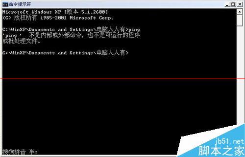 2、输入正常的ping命令,显示出错提示:不是内部或外部命令也不是可运行的程序或批处理。