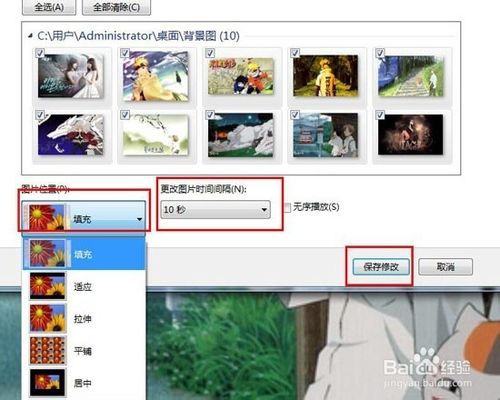 6、最后设置下图片的位置(填充、居中……)、更换图片的时间间隔(10秒、30秒……),勾选"无序播放"就是随机播放图片的,如果没有勾选就是有序的,设置好后选择”保存修改“!ps:尾图为背景轮换瞬间!