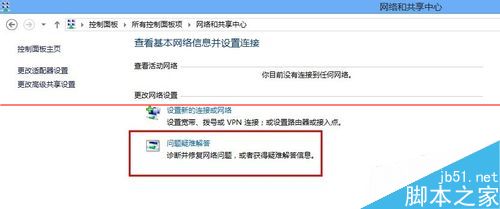 1、进入【控制面板】—>【网络与共享中心】,点击“问题疑难解答”。