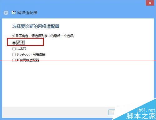 3、然后选择“网络适配器”界面中的“wifi”选项,点击下一步查询到问题原因。