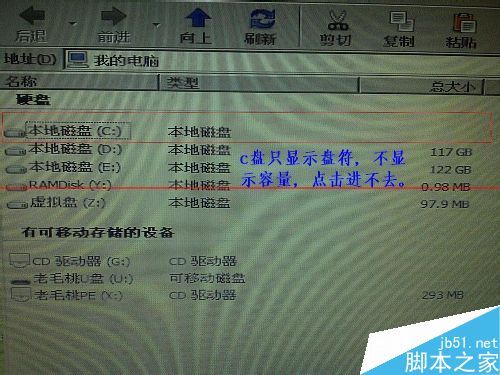 3.用U盘进入PE系统,可以看到所有盘符,但是只有c盘进不去