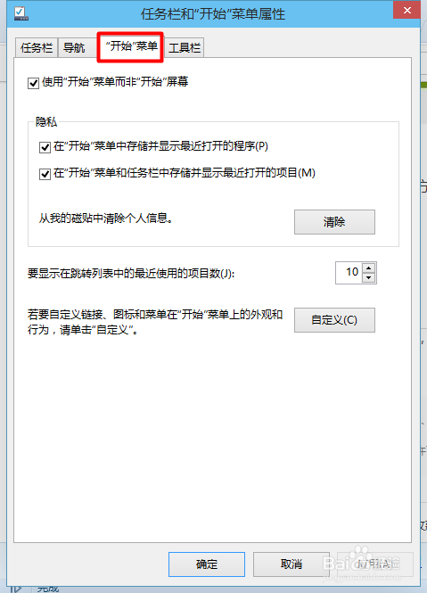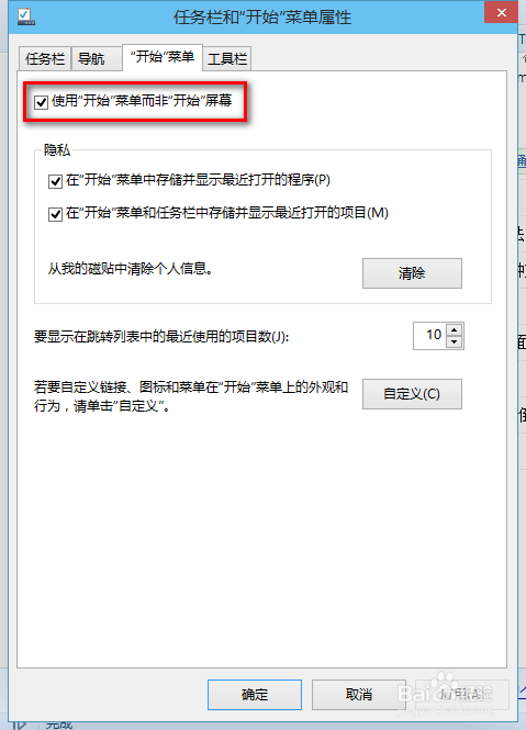 4、我们找到”使用开始菜单而非开始屏幕“前面的勾去掉。