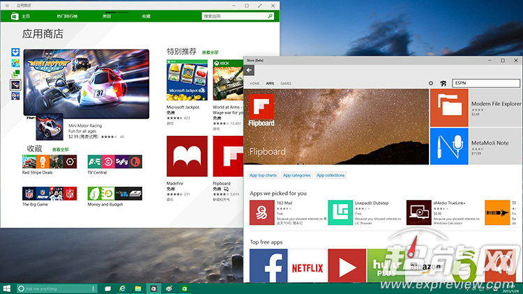 有意思的是,系统内置了两个不同版本的应用商店,左边这个是原有的,右边则是新的beta版,布局也是完全不一样了,看着更加简洁,不过响应速度以及下载速度还不是很好。