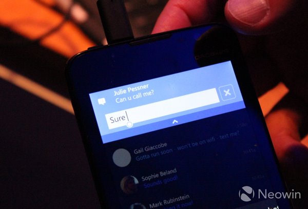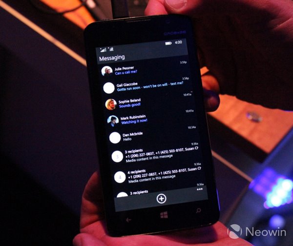 ▲Win10手机版消息应用,注意第二行消息的颜色,应当是系统集成的Skype消息