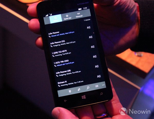▲Win10手机版电话应用,上面一排的三个按钮为历史、快速拨号和语音信箱
