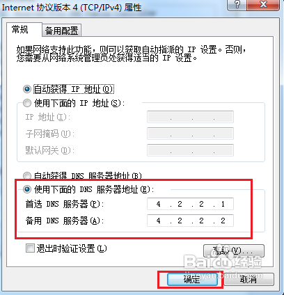 5、设置DNS服务器地址为:主用4.2.2.1,备用4.2.2.2,并点击确定退出。