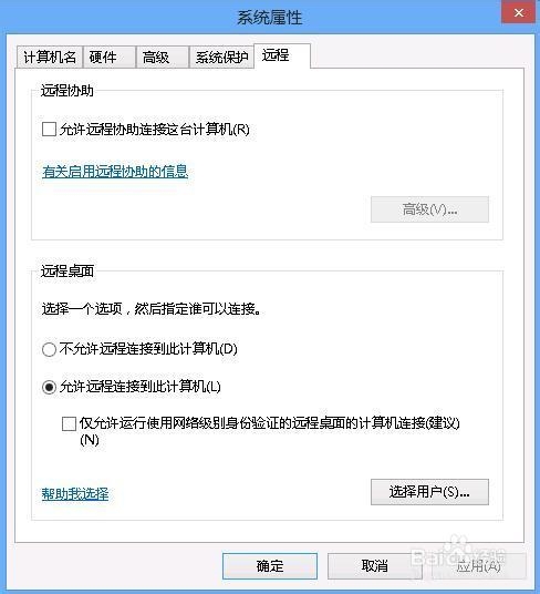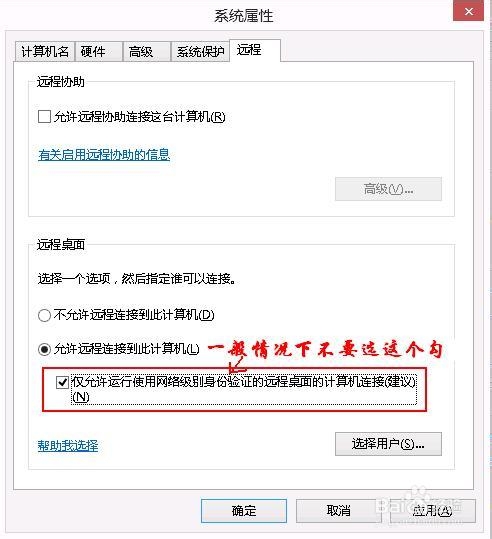 3、如果你在win8中设置了远程连接需要网络级别身份验证,由于xp默认没有开启,所以当xp连接win8远程桌面时,就会出现“客户端无法建立跟远程计算机的连接”错误提示。所以如果没有特殊要求,应该在win8中把“仅允许运行使用网络级别身份验证的远程桌面的计算机连接”的选取勾去掉。
