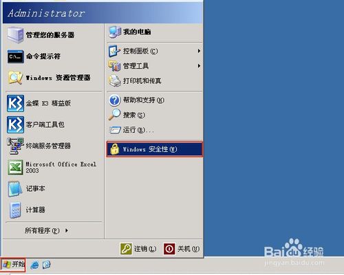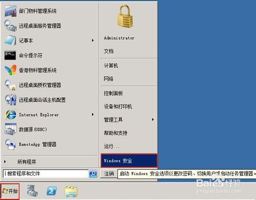 1、在远程桌面,点击左下角的开始菜单,点击“Windows 安全性”。