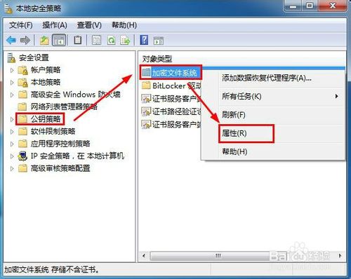 2、在打开的“本地安全策略”窗口中,单击“公钥策略”,然后在右侧的“对象类型”中选择“加密文件系统”右键单击,选择其中的“属性”项。