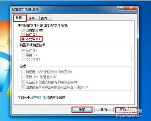 3、在出现的“加密文件系统 属性”窗口中选择“常规”标签,在“使用加密文件系统(EFS)的文件加密”下三个选项选择 “不允许”操作,再依次点击“应用“、”确定”。