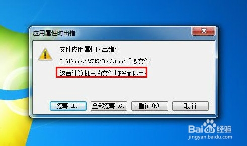 7、接着,会出现如下出错提示。如此,我们实现了禁止计算机文件加密的设置操作。