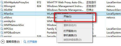 若显示为如下图所示简略信息模式,点击“详细信息”; 点击“服务”选项卡,找到WlanSvc(WLAN AutoConfig)服务,查看“状态”一栏是否是显示的“正在运行”;