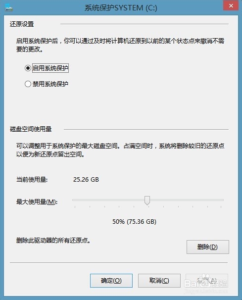 右键桌面的计算机图标-属性-系统保护-配置 可以看见当前系统保护使用量为25.26G,上限闸门为75.63G,所以每次安装/卸载软件都会自动备份创建还原点来占用
