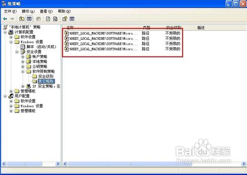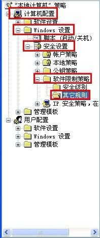 3、在左侧的控制台树窗口依次展开“计算机配置——Windows 设置——安全设置——软件限制策略——其他规则”
