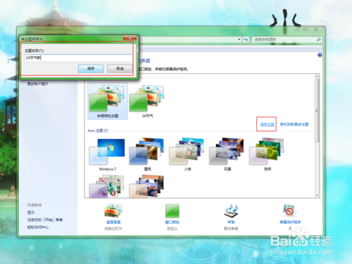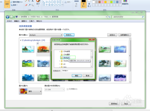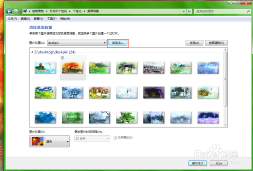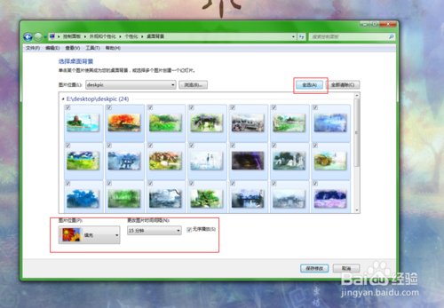 5、这是系统会读取文件里的一张设置成你的桌面,如何让文件里全部图片轮播呢?点击一下“全选”,让系统勾选你文件里的全部图片,”图片位置“,“图片间隔时间”可根据需要选择,如图7;到此设置完成。如果你想将这些保存成主题,只需如图8,选择保存主题,命名主题,即可。