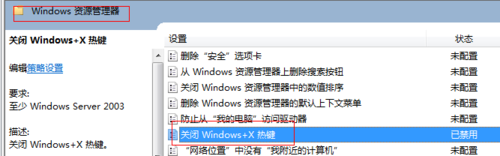 5、第五步:后退到用户配置-管理模板-windows组件-windows资源管理器,在里面找到【关闭windows+x热键】,按上面说的双击禁用或者未配置。