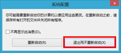 5、更改系统设置后,会弹出询问是否重新启动的对话框,可以选择【退出而不重新启动】,如下图所示: