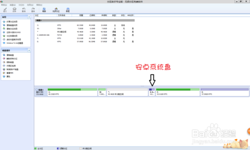 3、打开分区助手,找到安卓系统盘所在磁盘,如图,