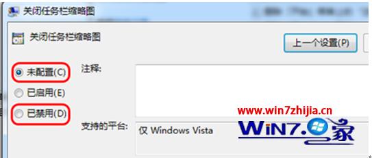 3、然后在窗口有侧中找到并双击“关闭任务栏缩略图”选项打开其属性窗口;
