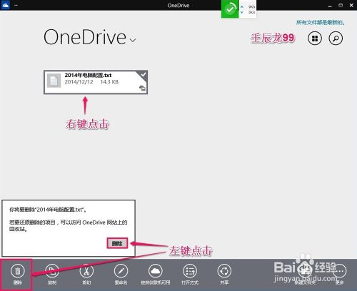 12、在OneDrive免费在线存储工具中删除文件(图片)的方法。如果我们要删除OneDrive免费在线存储工具中的文件(图片),可以按下述步骤完成:右键单击文件(图片),在工具栏中左键点击:删除,在弹出的的询问框中也点击:删除;