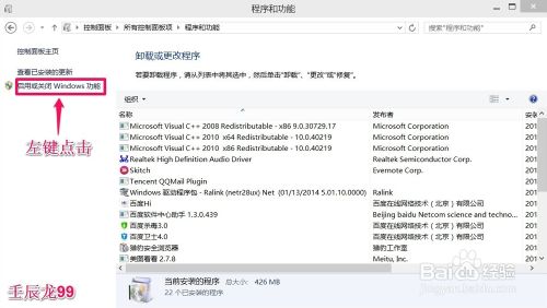 3、在程序和功能的对话窗口,我们左键点击:启用或关闭Windows功能;