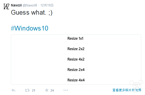 根据图中信息显示,Windows 10 中将会带来如下 1x1、2x2、4x2、2x4、4x4尺寸规格,但 Nawzil 并未指明这些具体将是什么功能/特性的外观尺寸,不过从众多用户的回复来看,其指代新版磁贴尺寸的可能性非常大。