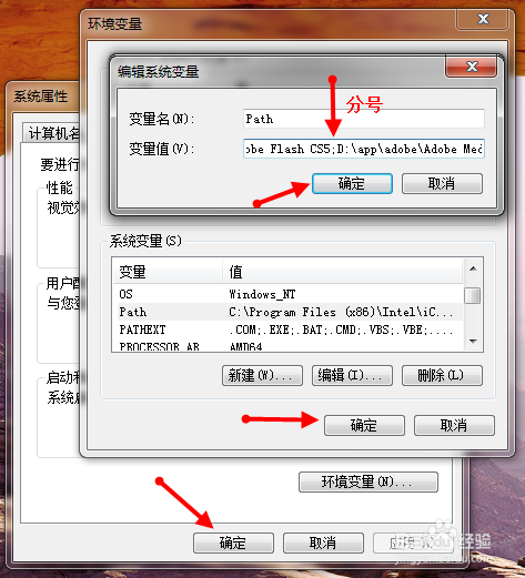 修改完毕之后一定要记得全部点击“确定”才能够保存修改的内容。一个路径和另一个路径之间要记得用分号隔开。三个窗口中的按钮都需要点击“确定”才能保存修改的内容。