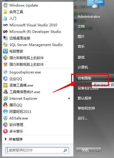 2、点击开始菜单,选择控制面板项打开,如下图: