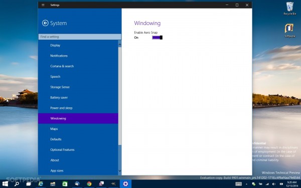 在最新曝光的版本号为9901的Windows 10系统中,用户能够通过PC Setting屏幕简单启动,首先跳转到“系统”页面,点击“Windowing”,然后其中一个选项称之为“Enable Areo Snap”,通过简单的点击能够开启或者关闭。