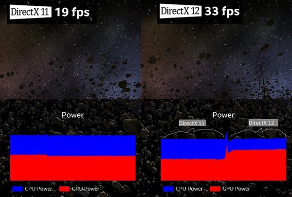 具体而言,英特尔演示了一段游戏 Demo,在 DirectX 11 下只有 19fps 的帧数,而在 DirectX 12 下却上升了 33fps。也就是说,在使用完全相同的硬件时,DirectX 12 相比 DirectX 11 的游戏性能提高了 70% 左右。