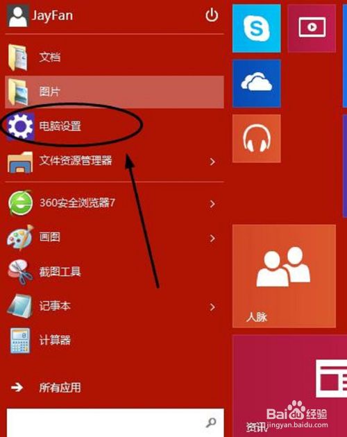 1、在win10系统桌面,点击“开始”菜单,点击“电脑设置”。如下图。