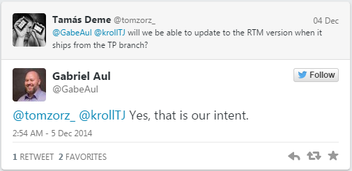 但是现在看来,微软可能已经改变了这个政策。当被问及“我们能否从技术预览版升级至RTM版本”时,微软的Gabriel Aul在Twitter上答复到——“是的,我们正有此意”。