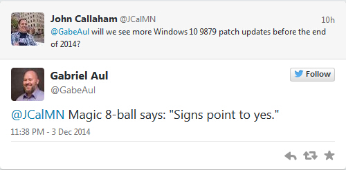 今天上午,当在Twitter上被问及“年底前是否会有更多Windows 10 9879补丁更新”时,加里布埃尔·奥尔(Gabriel Aul)谐趣地答道:“有迹象表明,是的”。