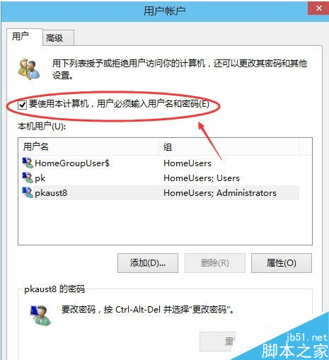 第三步:点击后,在用户帐户对话框里可以看到“要使用本计算机,用户必须输入用户名和密码”被勾选中了